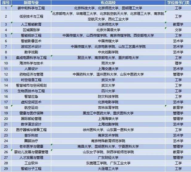 新增的29个专业主要集中在人工智能、大数据、集成电路、生物育种、智慧农业、健康科技 等前沿领域。例如:电子信息材料、智能感知工程(服务半导体和先进制造)、生态修复学、健康科学与技术(响应生态文明和健康中国)等专业,直指科技自立自强和新质生产力需求。