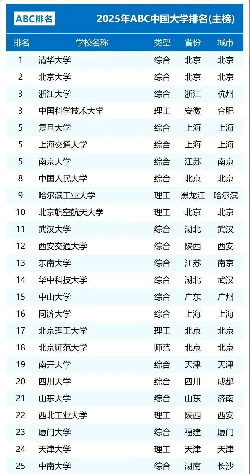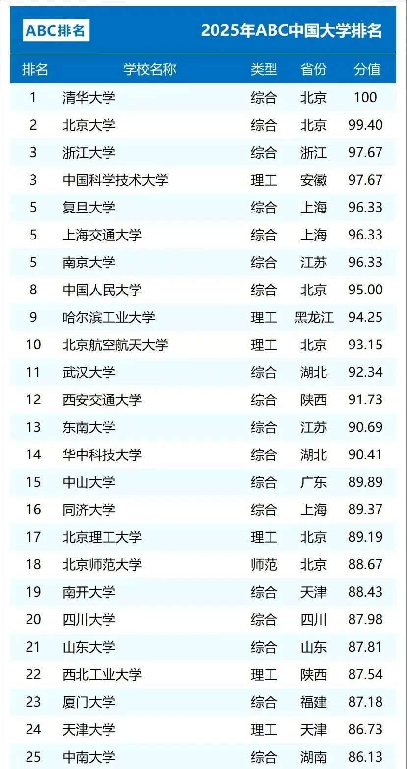 2025年ABC中国大学排名(主榜)