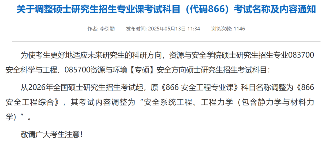 从2026年全国硕士研究生招生考试起,原《866 安全工程专业课》科目名称调整为《866 安全工程综合》,其考试内容调整为“安全系统工程、工程力学(包含静力学与材料力学)”。