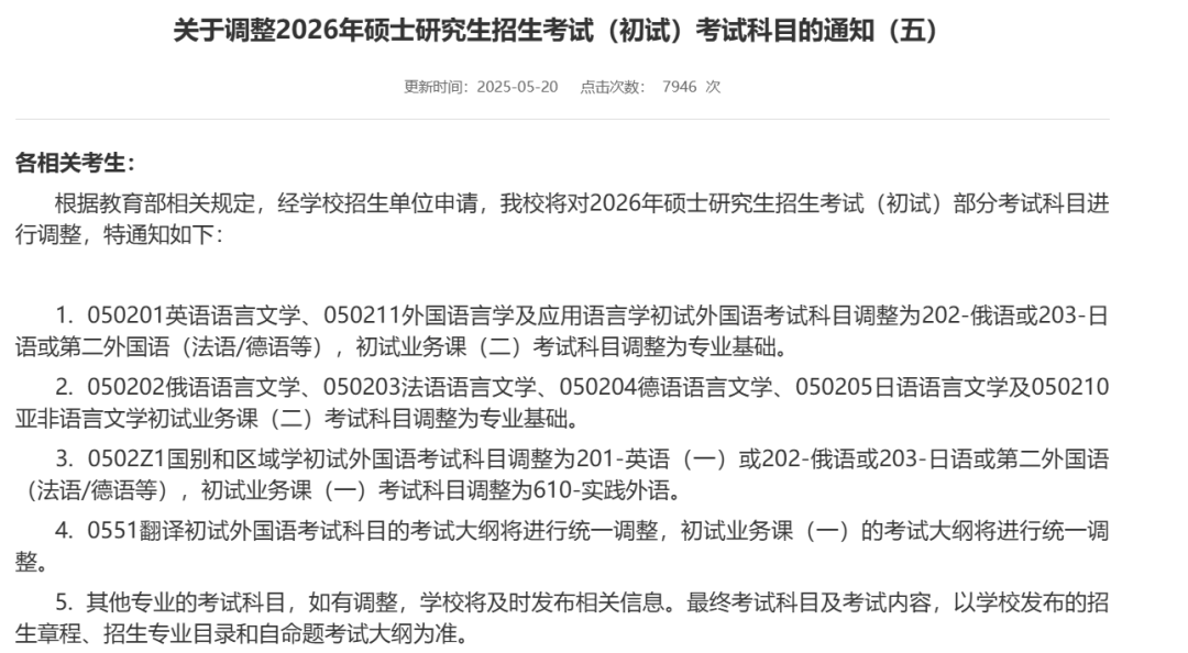 8.翻译初试外国语考试科目的考试大纲将进行统一调整,初试业务课(一)的考试大纲将进行统一调整。