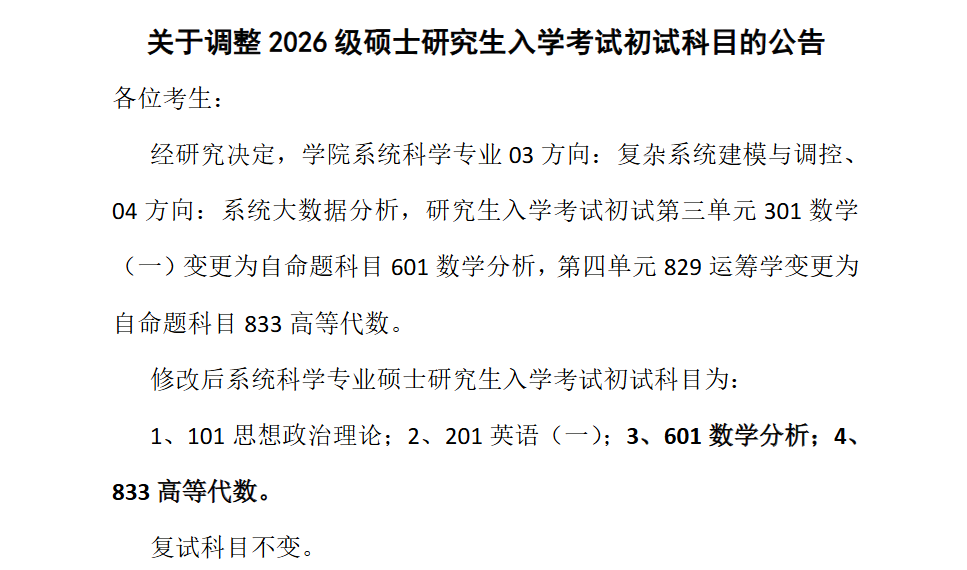 修改后系统科学专业硕士研究生入学考试初试科目为:1、101思想政治理论;2、201英语(一);3、601数学分析;4、833高等代数。复试科目不变。