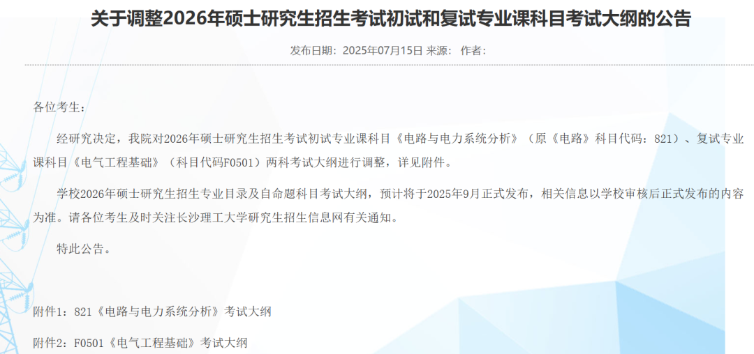 长沙理工大学电气与信息工程学院:对2026年硕士研究生招生考试初试专业课科目《电路与电力系统分析》(原《电路》科目代码:821)、复试专业课科目《电气工程基础》(科目代码F0501)两科考试大纲进行调整: