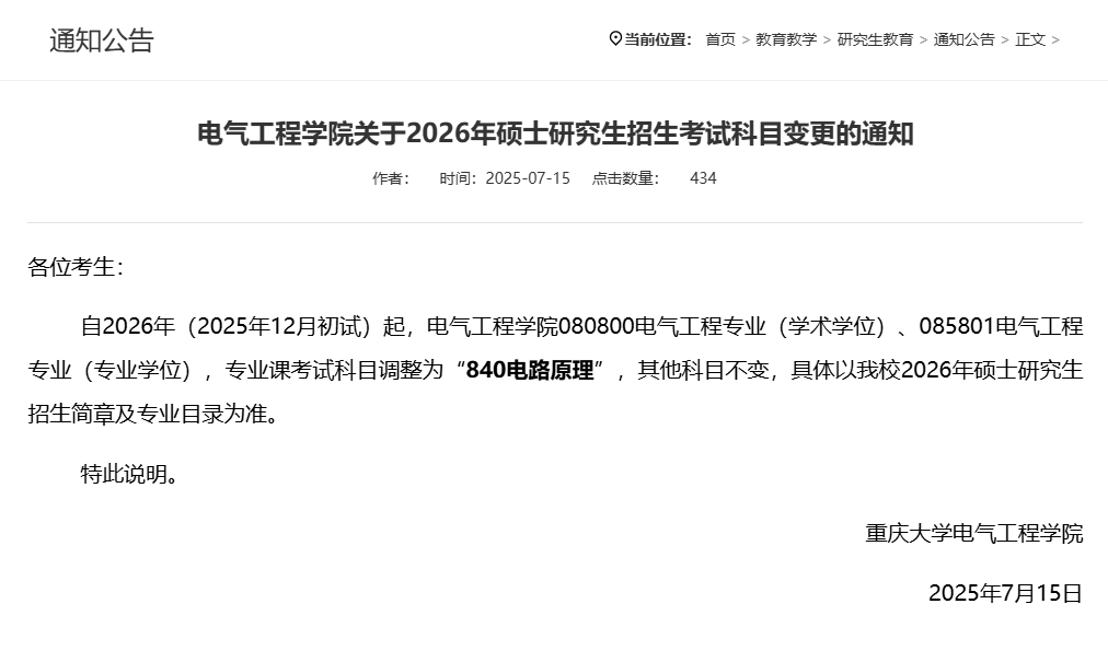 自2026年(2025年12月初试)起,电气工程学院080800电气工程专业(学术学位)、085801电气工程专业(专业学位),专业课考试科目调整为“840电路原理。