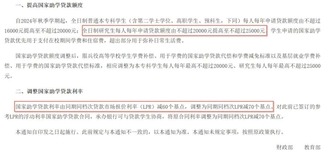 自2024年秋季学期起,全日制普通本专科学生(含第二学士学位、高职学生、预科生)每人每年申请贷款额度由不超过16000元提高至不超过20000元;全日制研究生每人每年申请贷款额度由不超过20000元提高至不超过25000元