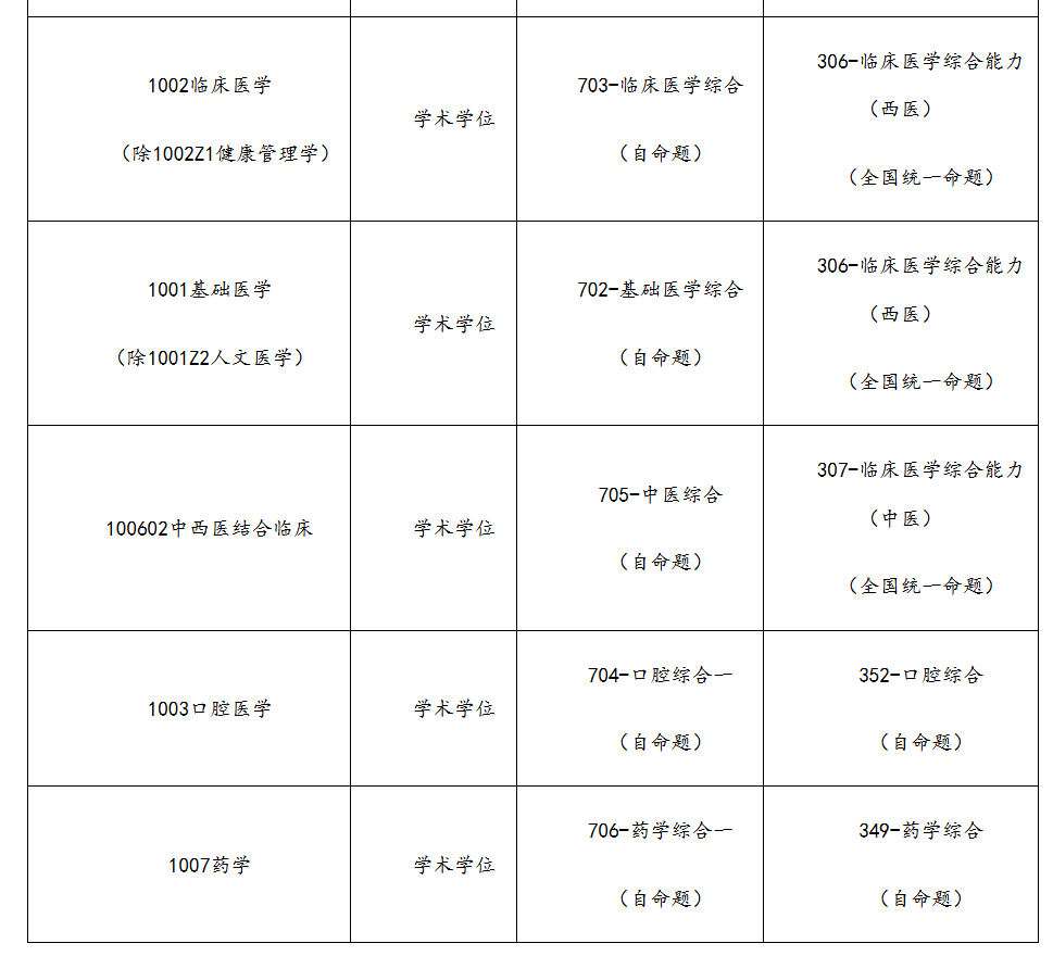 1001基础医学(除1001Z2人文医学):自命题702基础医学综合调整为306临床医学综合能力(西医)(全国统一命题)