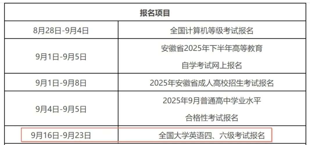 根据安徽省教育考试院官网发布的9月考试日历,全国大学四六级考试报名时间为9月16日-9月23,考试时间预计为12月中旬,甚至更早一点。