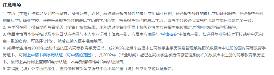🆙如符合报名要求的最后学历对应的是曾用名或曾用证件号码,学历(学籍)校验会不通过。考生是否具有报考资格由报考点及招生单位根据相关文件确定。