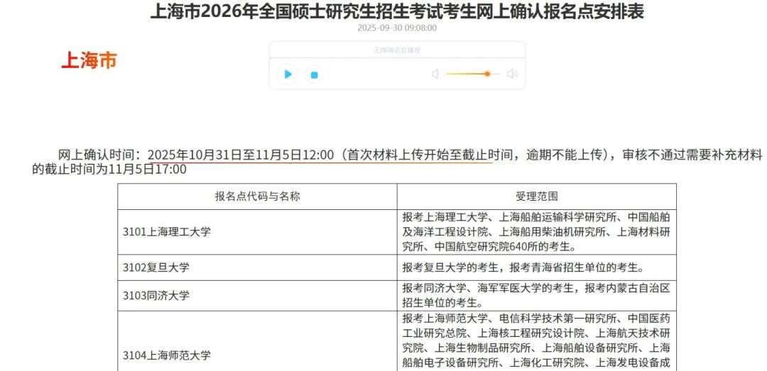 上海市网上确认时间:2025年10月31日至11月5日12:00(材料上传开始至截止时间),审核不通过需要补充材料的截止时间为11月5日17:00