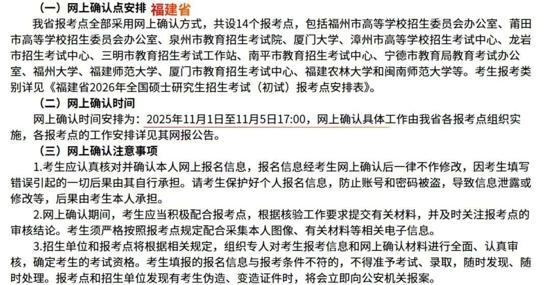 福建省网上确认时间:2025年11月1日至11月5日17:00,网上确认具体工作由各报考点组织实施
