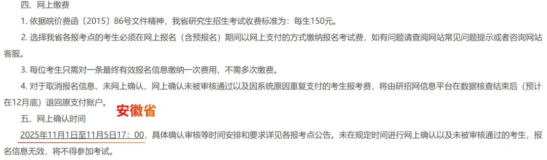 安徽省网上确认时间:2025年11月1日至11月5日17:00,具体确认审核等时间安排和要求详见各报考点公告。