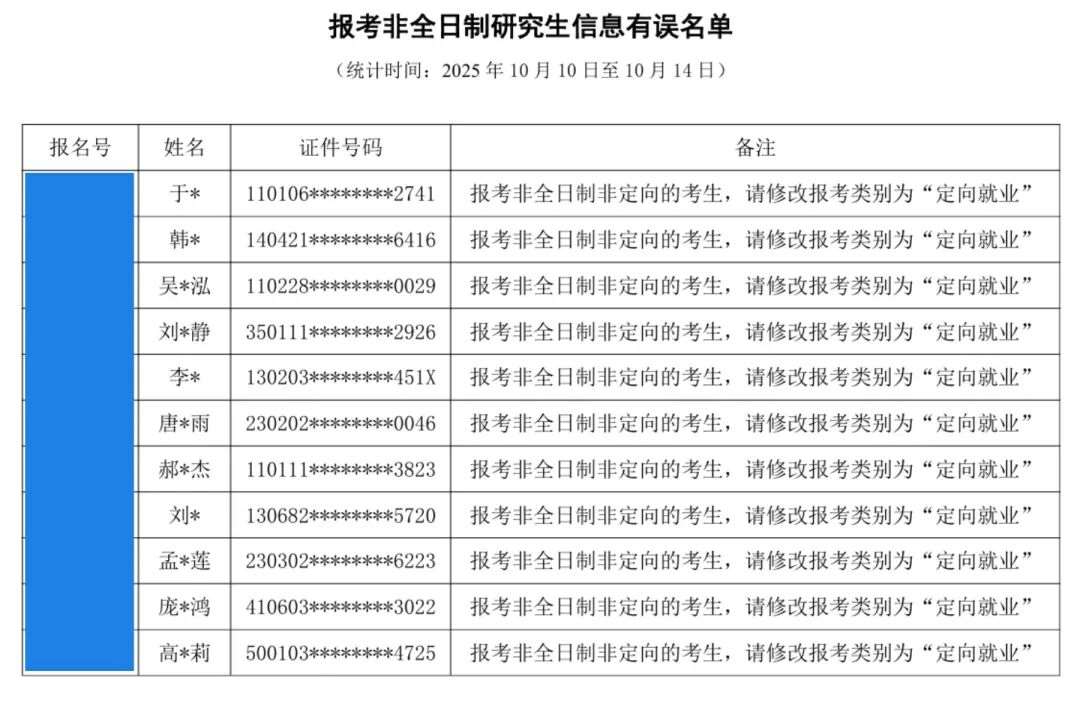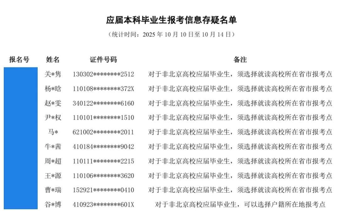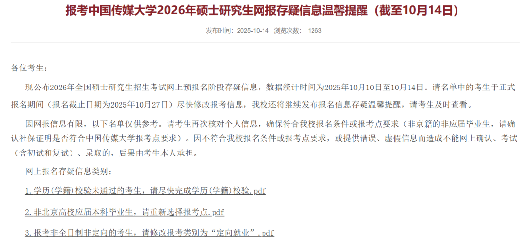 中国传媒大学发布了预报名期间报名信息存疑的名单,其中主要涉及学历(学籍)核验未通过、报考点错误、定向生问题。