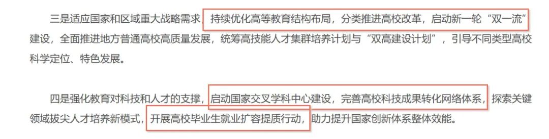 会议明确表示,持续优化高等教育结构布局,分类推进高校改革,启动新一轮“双”建设。
