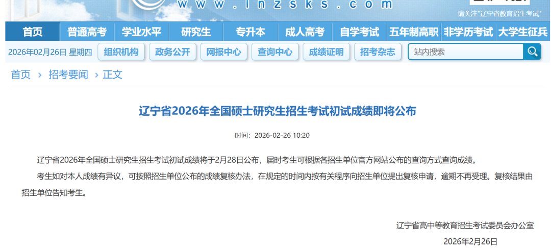 辽宁省教育考试院:2026年全国硕士研究生招生考试初试*将于2月28日公布