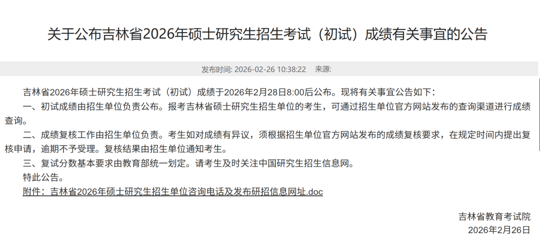 吉林省教育考试院:2026年硕士研究生招生考试(初试)*于2026年2月28日8:00后公布