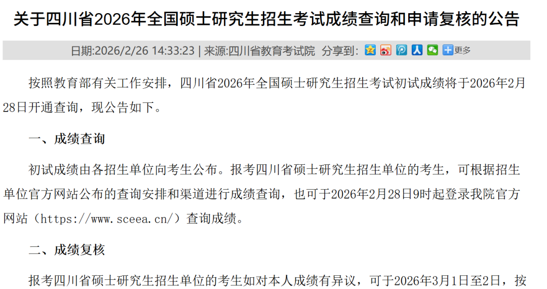 四川省教育考试院:2026年全国硕士研究生招生考试初试*将于2026年2月28日开通查询