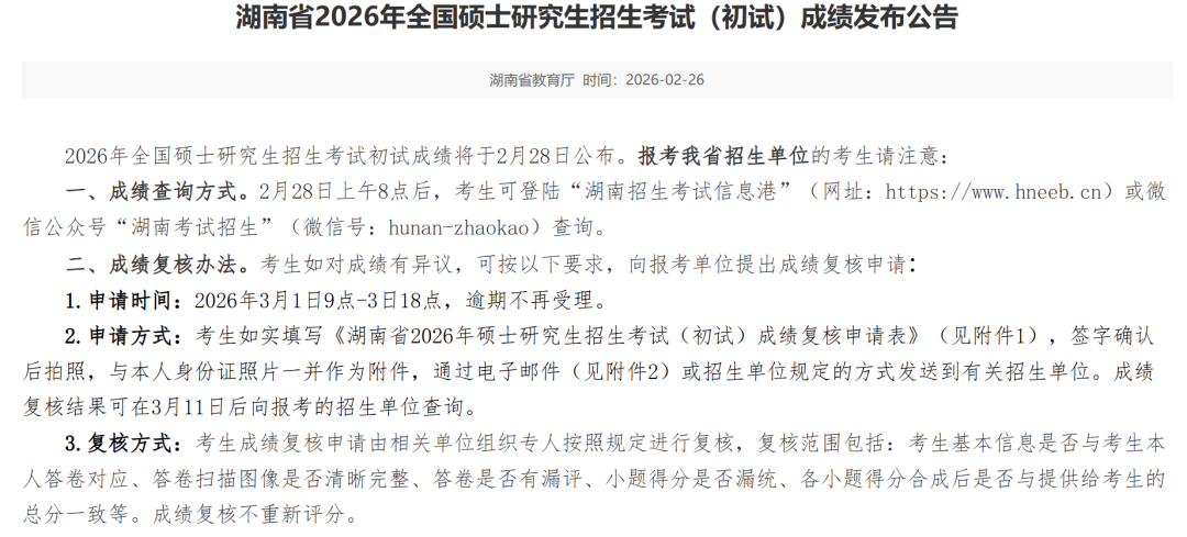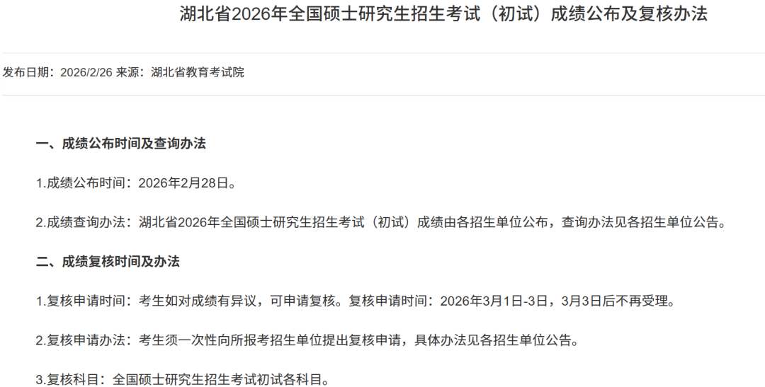 湖北省教育考试院:2026年全国硕士研究生招生考试(初试)*公布时间:2026年2月28日