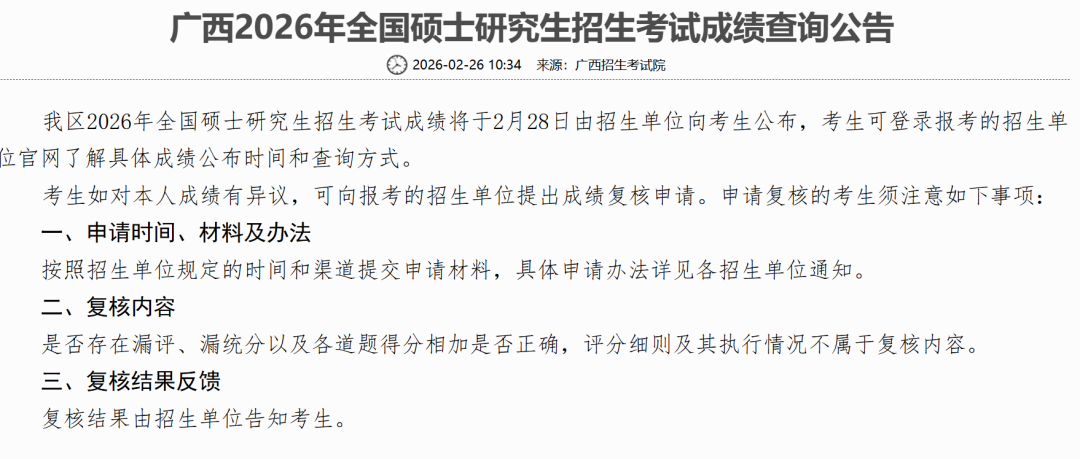 广西壮族自治区招生考试院:2026年全国硕士研究生招生考试*将于2月28日由招生单位向考生公布