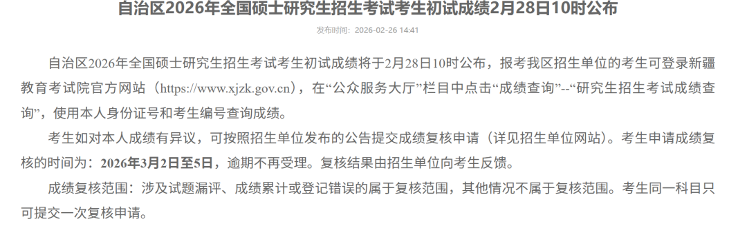 新疆自治区:2026年全国硕士研究生招生考试考生初试*将于2月28日10时公布