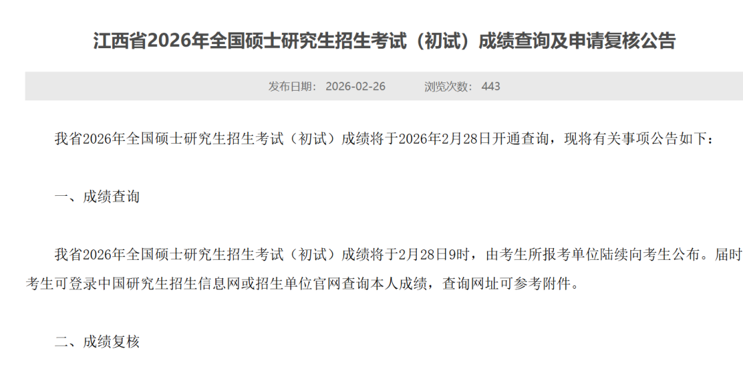 江西省教育考试院:2026年全国硕士研究生招生考试(初试)*将于2月28日9时,由考生所报考单位陆续向考生公布。