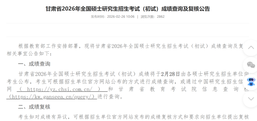 甘肃省教育考试院:2026年全国硕士研究生招生考试(初试)*将于2月28日由各硕士研究生招生单位向考生公布