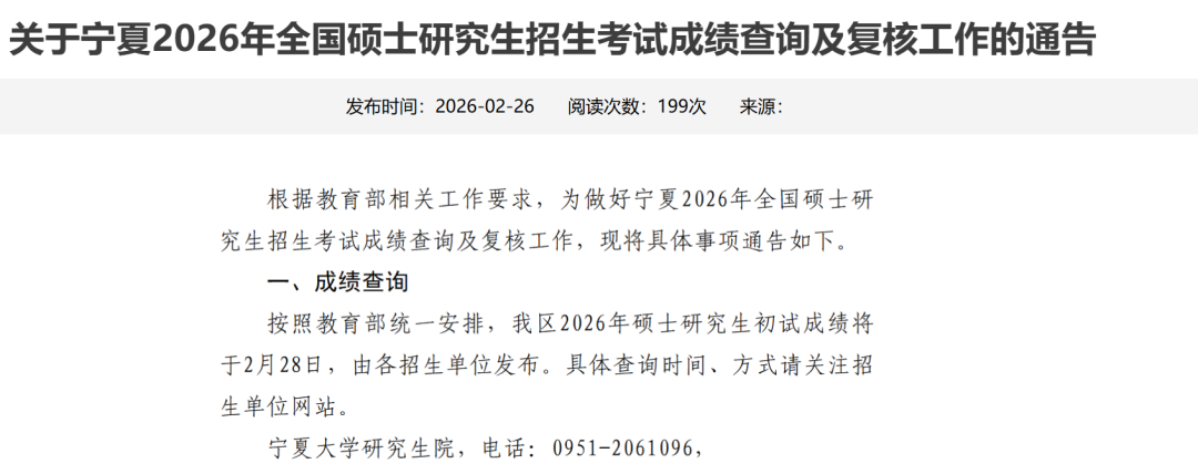 宁夏教育考试院:2026年硕士研究生初试*将于2月28日,由各招生单位发布。