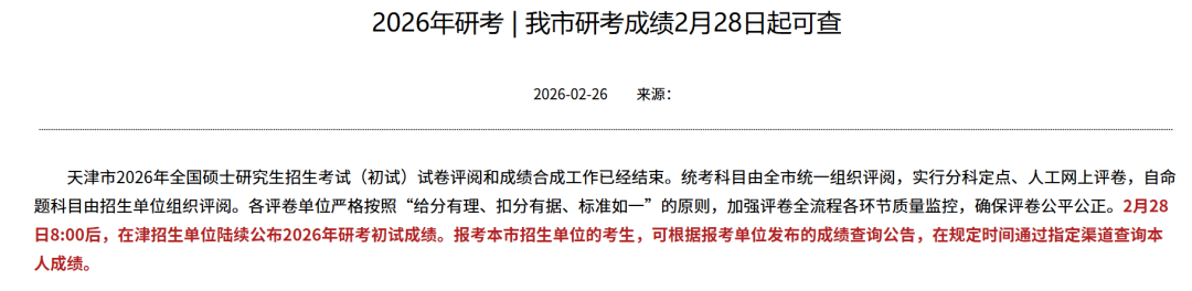 天津市教育考试院:2月28日8:00后,在津招生单位陆续公布2026年研考初试*