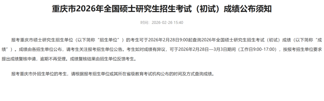 重庆市教育考试院:硕士研究生招生单位(以下简称“招生单位”)的考生可于2026年2月28日9:00起查询