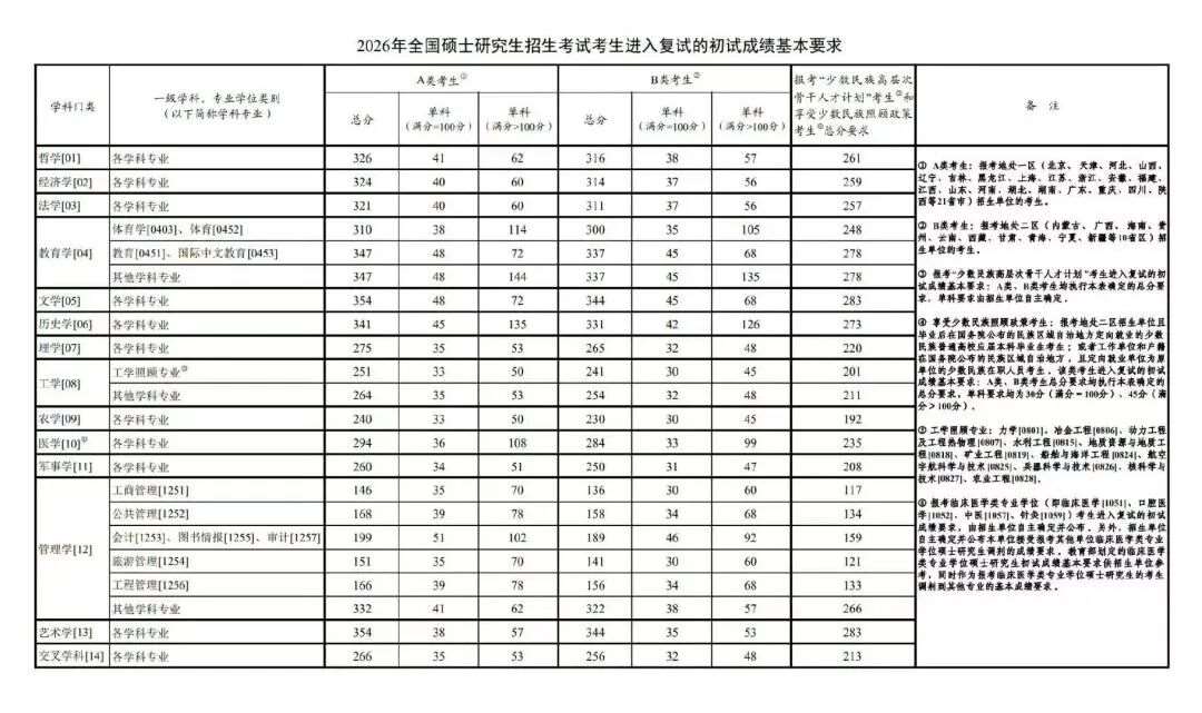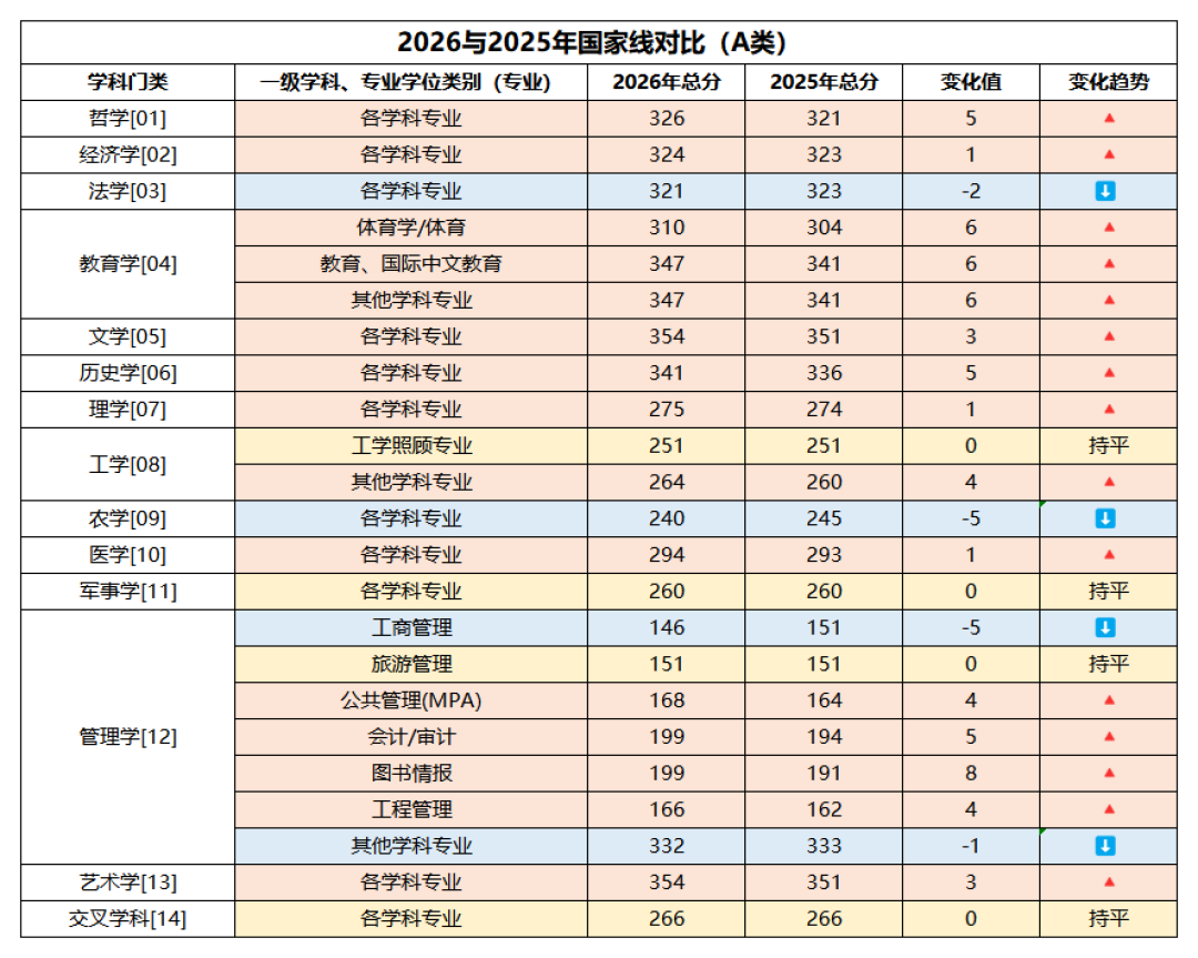 与2025年相比,2026年国家线呈现 “普遍小幅上涨,少数持平或下降” 的整体趋势。