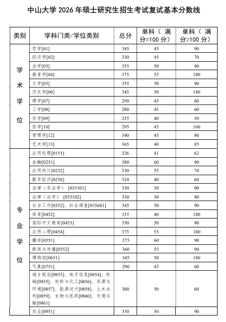 中山大学学硕复试线基本稳定,但专硕部分专业涨幅较大。数字文化管理分数上涨170分,公共政策上涨140分,文献与文化遗产保护上涨120分,审计上涨55分。