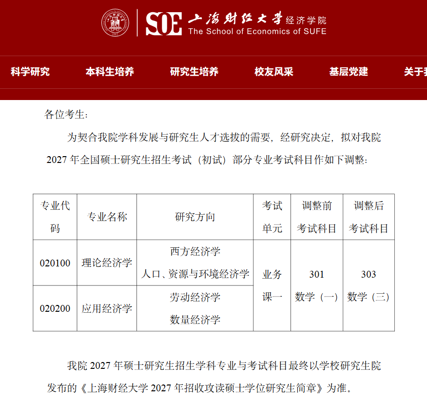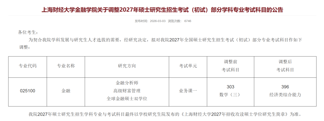 2027考研初试科目业务课一由303数学三调整为396经济类综合能力