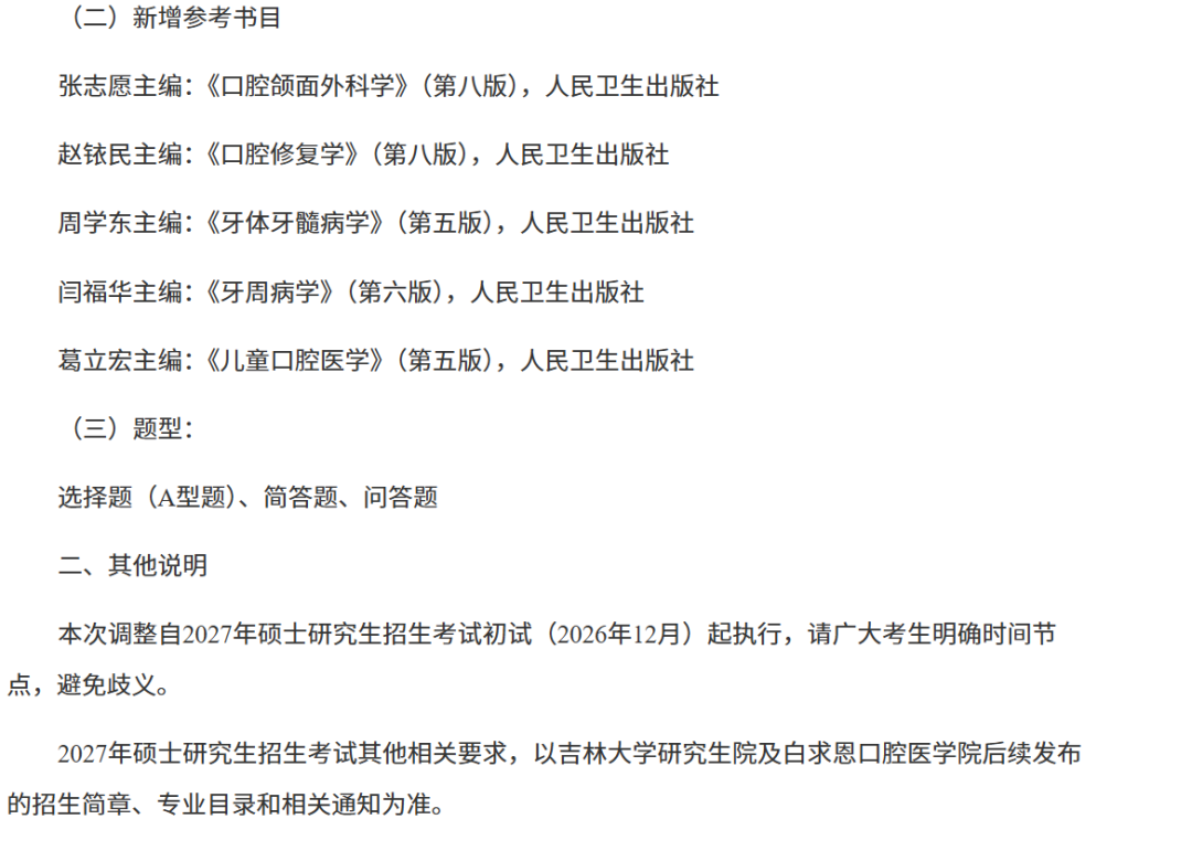 吉林大学白求恩口腔医学院:调整2027硕士研究生招生考试初试参考书目与题型