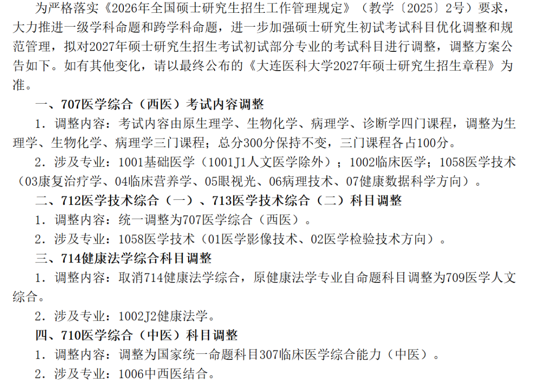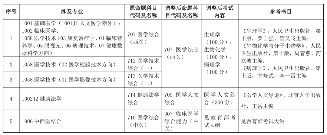 710医学综合(中医)科目调整:调整为国家统一命题科目307临床医学综合能力(中医)。