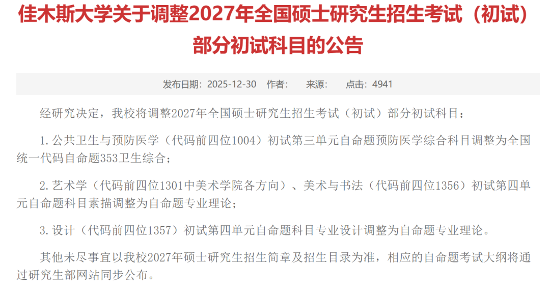 公布2027年硕士研究生招生考试自命题科目调整方案