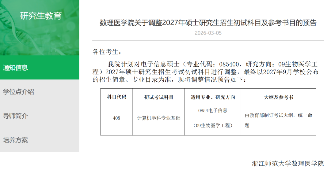 对电子信息硕士(专业代码:085400,研究方向:09生物医学工程)原826信号与系统进行调整,改为408计算机专业基础,由教育部制订考试大纲,统一命题。