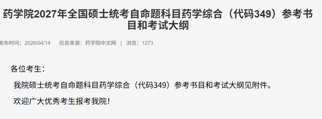 药学院发布硕士统考自命题科目药学综合(349)参考书目和考试大纲